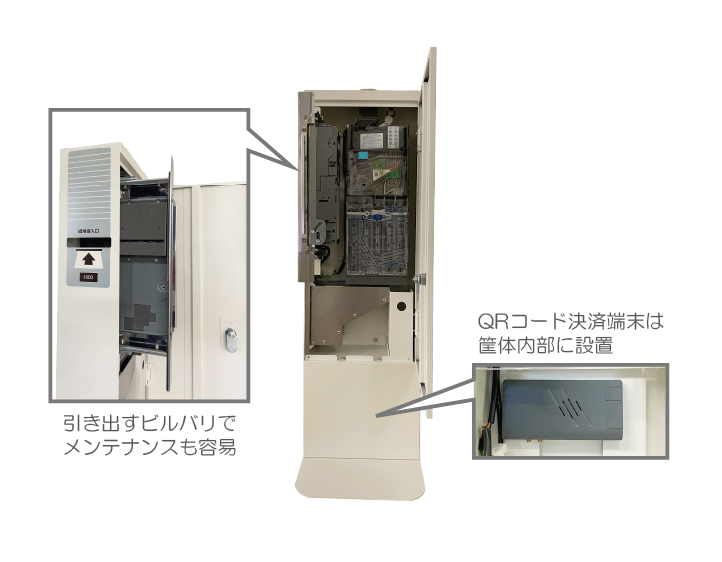 国内最薄クラスの筐体設計: 従来のコインメック・ビルバリを組み込んだボックスタイプがそのまま。設置場所を選ばず、スマートな外観で空間に溶け込みます