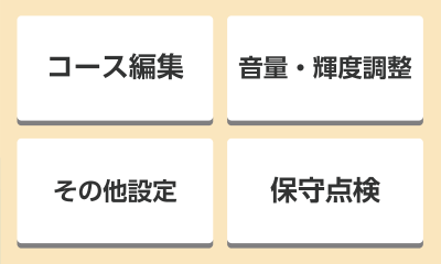 売上管理として、コース毎の販売回数や総売上などの確認ができます。また、コースの料金 / 時間設定や音量 / 輝度調整も行えます。
